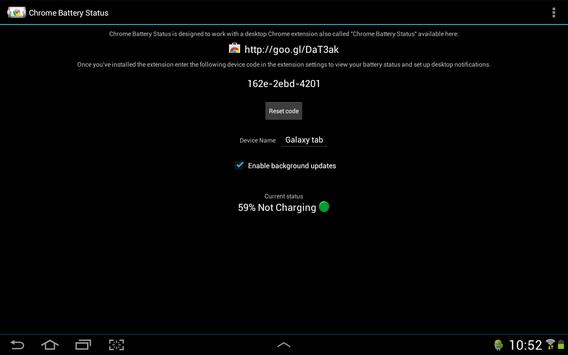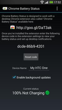 Chrome battery status is designed to work with a Chrome desktop extension (plugin for chrome desktop) also called "Chrome Battery Status" available from the Chrome Web Store