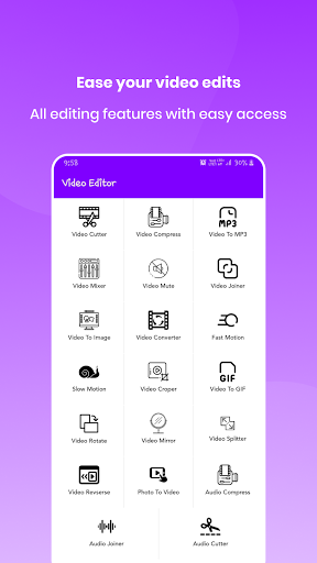 Create awesome videos with the video editing features (Video cutter, Video compress, Video mixer, Video joiner, Video to Image, Video converter, Fast Motion, Slow Motion, Reverse Video, Video cropper, Video to GIF, Video rotate, Video Mirror, Video splitter, Image to video, Audio Joiner, Audio cutter)