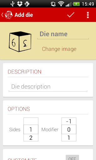 * Customize your dice bag: add, edit or remove dice
