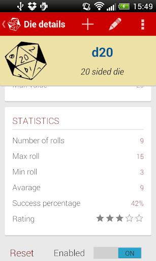 The complete version of this application includes new features like managing custom dice bags and more play statistics! Get Advanced Dice Roller PRO here: https://play.google.com/store/apps/details?id=com.lorenzocioni.advancedicerollerpro