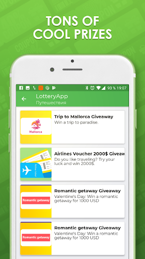 Thousands of lucky winners have already received cool prizes absolutely for free. What are you waiting for? Just download our Lottery App and check your luck right now! Simple registration, user-friendly interface, regular updates-that is not a complete list of the advantages of this application. Every day you get a chance to win valuable awards – a smartphone, home appliances, a romantic trip and even a car! Or maybe you want to get a great sum of cash? And such contests are available here! Participate only in those contests that you choose. Be a lucky player-anytime anywhere!