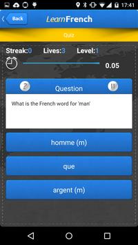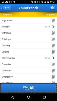 A user friendly and simple French language app with numerous learning tools such as a game, recording, playback, Wordbank, search words, Google Play leader boards, learnt words tally, hide words playback all covering 1000 words & 80 useful phrases broken down into 23 manageable subject areas allowing you to learn at your own pace. Learn French Words is suitable for all ages and abilities whether you are a beginner, wanting to brush up on your knowledge, test against your friends or use as a language guide when visiting a French speaking country.