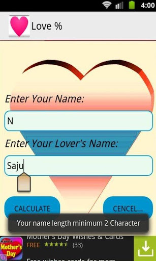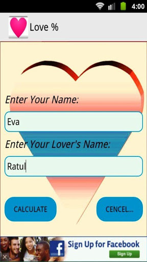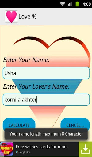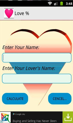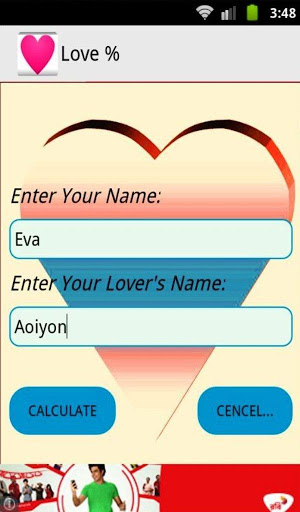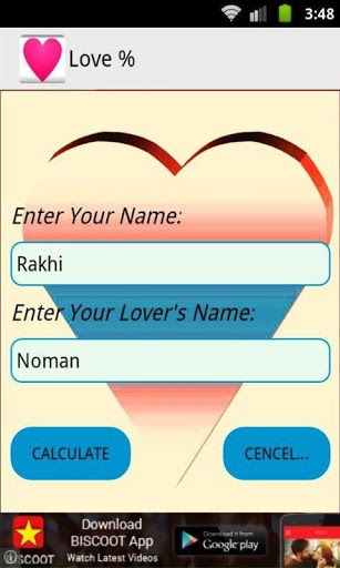 Calculate the percentage of love to input your name and your's lover's name.Enjoy the life very nicely with your lover's.
