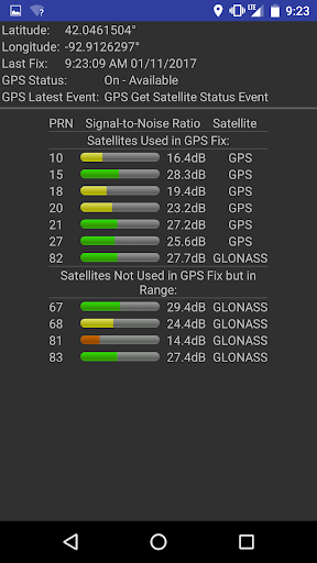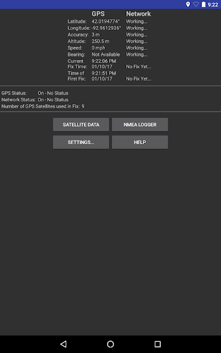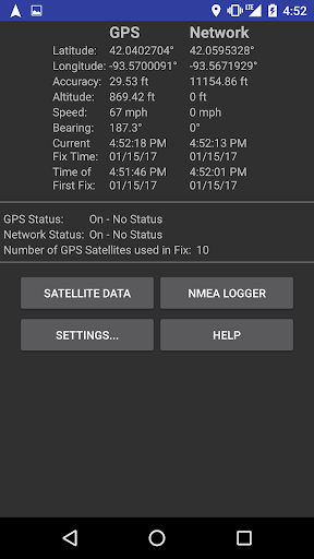 GPS Info & NMEA Logging allows you to view and compare the difference between your network/Wi-Fi location and your GPS module location. There are two other screens in addition to this main view: