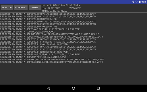The NMEA Logger View shows all of the NMEA 0183 messages that are being received by the GPS module. It gives the option to save the log into memory that can either be looked at later or pulled off the device and onto a computer for easier viewing.