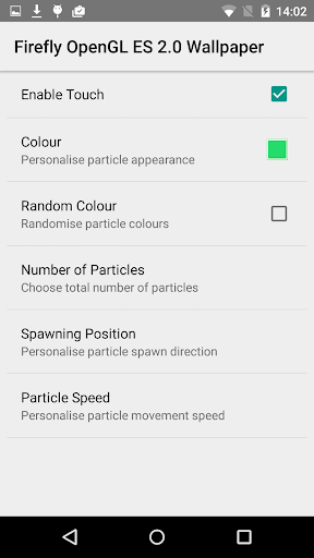 This wallpaper for your Android system and lockscreen uses OpenGL ES 2.0 to render a high quality particle system. You will have the impression of hundreds of fireflies drifting across your device, they respond to touch and may be personalised to your desires.