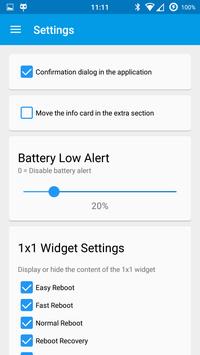 In the settings you can set if display the confirmation dialog when you do an action, the alert dialog if the battery percentage is under a certain level and the items on the 1x1 widget!