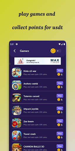 The highlight of this app lies in its diverse game collection. Whether it's brain-teasing puzzles or adrenaline-pumping adventures, there's a game for every taste. Immerse yourself in captivating worlds while accumulating real USDT rewards along the way.