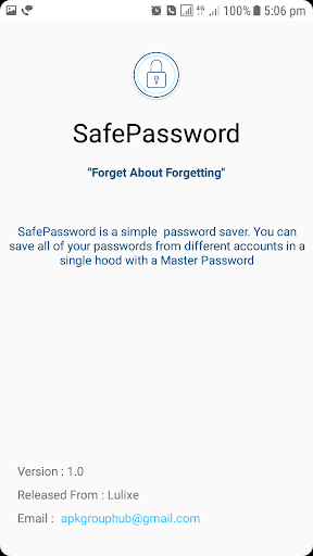 "Forget About Forgetting" Safe Password is a simple password saver. You can save all of your passwords from different accounts in a single hood with a Master Password.