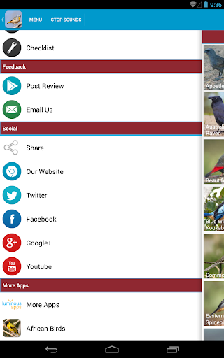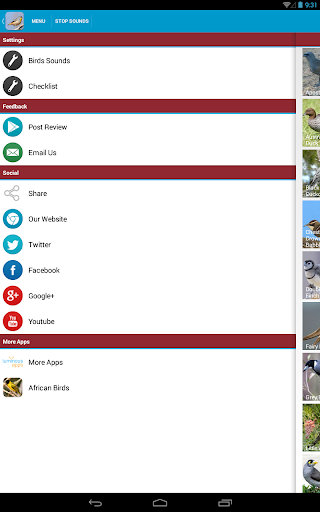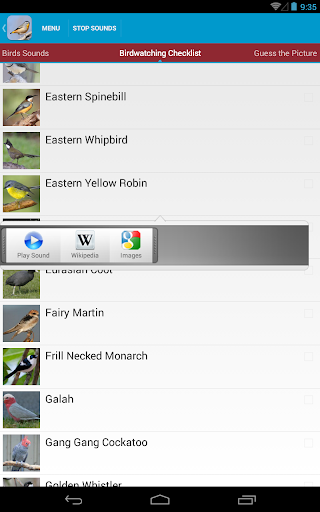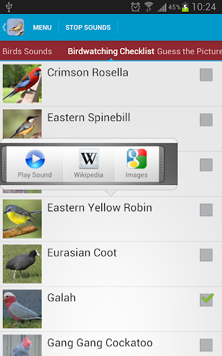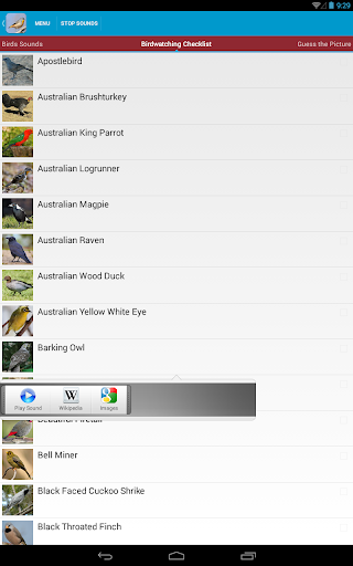 A Birdwatching checklist is included allowing you to tick off birds you have seen. Tapping on a bird on the checklist screen allows you to view more information about the bird on Wikipedia or perform an image search via Google images.