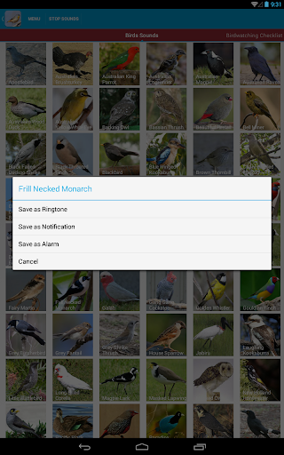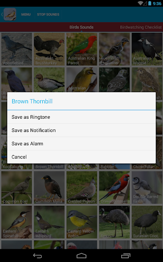 Bird Sounds can be played by tapping on a bird picture. All sounds can be saved as Ringtones, Notifications and Alarms by long pressing on a bird and selecting the relevant option.
