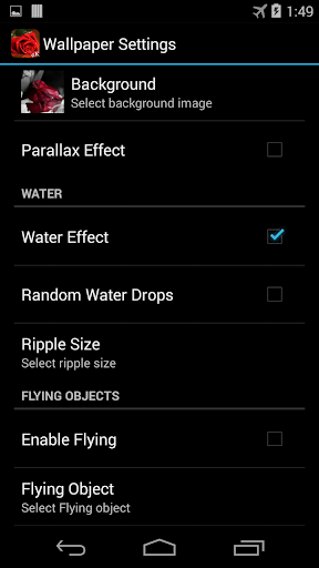 You can select different background image, enable/disable parallax and animation, select flying particles, enable or disable effect of water and virtual water drops, etc.