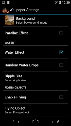 You can select different background image, enable/disable parallax and animation, select flying particles, enable or disable effect of water and virtual water drops, etc.