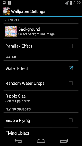 You can select different background image, enable/disable parallax and animation, select flying particles, enable or disable effect of water and virtual water drops, etc.