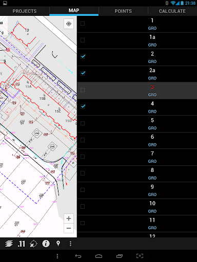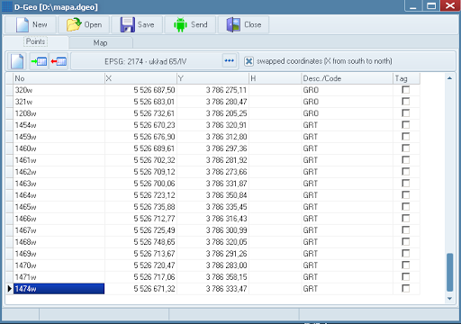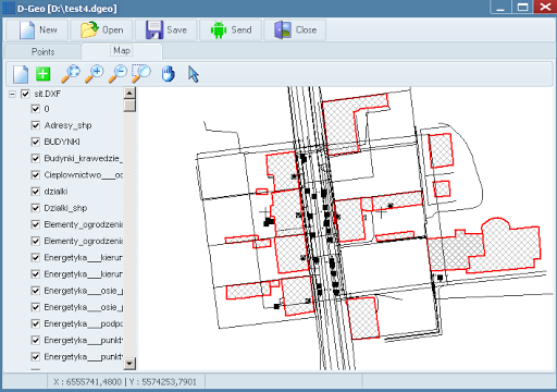 Application can also paint your own map. You can prepare data for android app thanks to PC application (you can download it for free from http://d-geo.pl). This application can import points from txt or xls files, import vector or raster data from many formats: Autocad (dxf, dwg), Microstation (dgn), ArcView shape (shp), Google Earth (kml), GML, GPX, MapInfo (mif, tab), geotiff and other. All imported files are combined into one dgeo project file used in android app. Map part are prepared as tiles – so this take a some time and some disk space (using only points produced small files). Since the v.0.94 map can be exported also as vectors. PC application can send your project file to android device (logged in the same wi-fi network). You can also put dgeo project file to Dropbox or copy directly to D-GEO directory on SD card.