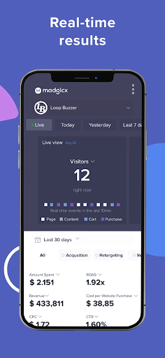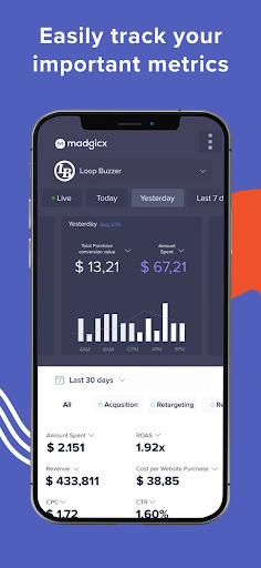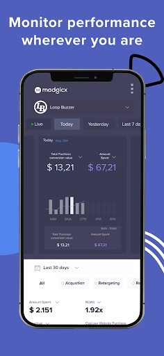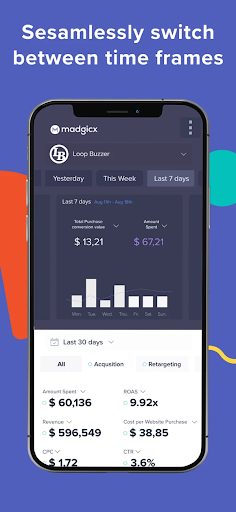 Sign up or log in to Madgicx Mobile and get immediate reporting. Seamlessly switch between different time frames by swiping right and left.