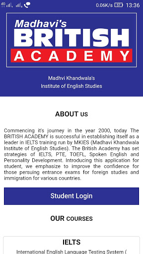 Commencing it's journey in the year 2000, today The BRITISH ACADEMY is successful in establishing itself as a leader in IELTS training run by MKIES (Madhavi Khandwala Institute of English Studies). The British Academy has set strategies of IELTS, PTE, TOEFL, Spoken English and Personality Development. Introducing this application for student, we emphasize to improve the confidence for those persuing entrance exams for foreign studies and immigration for various countries.