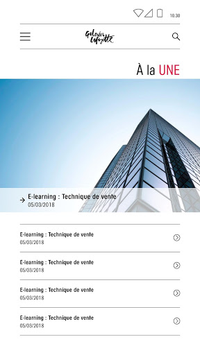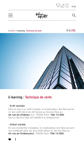 Cette application contient toutes les informations pratiques du magasin Galeries Lafayette Haussmann (organigrammes, marques, services…) afin de permettre aux collaborateurs d’exercer au mieux leur travail et d’améliorer le service client. On y trouve également l’actualité stratégique, commerciale et évènementielle du magasin. Il s’agit d’une application exclusivement destinée aux salariés des Galeries Lafayette Haussmann.