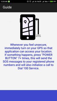 Whenever you feel unsecure, immediately turn on your GPS to let the application access your location, press "Power Button" 7 times to send the SOS messages to your registered phone numbers and initiate a call to Dial100 service. Your current location will be forwarded through the SMS and call recording will be started for the evidence purpose.