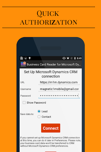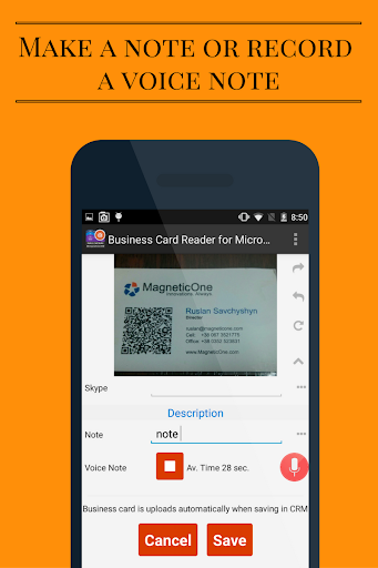 Business Card Reader for MS Dynamics CRM is the easiest, fastest and secure solution for transferring information from paper business cards into the CRM systems using the camera of your smartphone. Take a picture of a business card and the application will scan and instantly export all card data directly to your CRM. In addition, this app will help you learn more about a potential client, partner or colleague. It is one of the best apps for CRM systems.