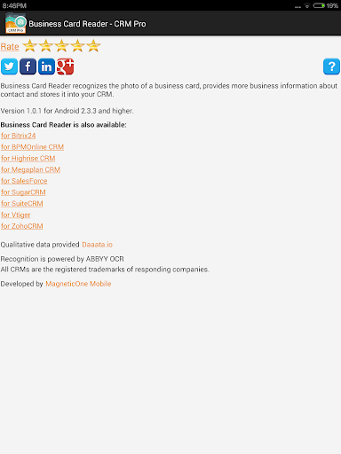 Snap a photo of the business card and Business Card Reader CRM Pro instantly exports all card data directly into your CRM. Moreover, this app helps you to find out more information about your potential client, partner, or colleague.