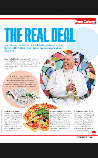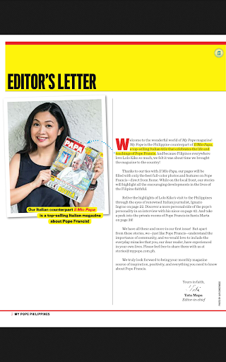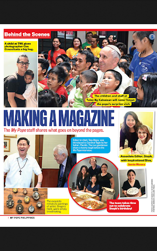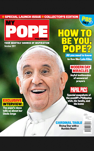 My Pope Philippines is an adapted English version of Italian magazine, Il Mio Papa, dedicated entirely to Pope Francis. Every month, My Pope describes the life of the Holy Father, an emotional ride of meetings, words, and simple gestures of his daily life that highlight the important message of change that permeates his pontificate. At least 65% of the content is international and 35% is created by the local editorial team in the Philippines to feature stories highlighting the encouraging developments in the lives of Filipinos, whose values and actions reflect those that the Pope stands for, with sections on good news, inspiring stories, traditions, arts and crafts and everyday heroes.
