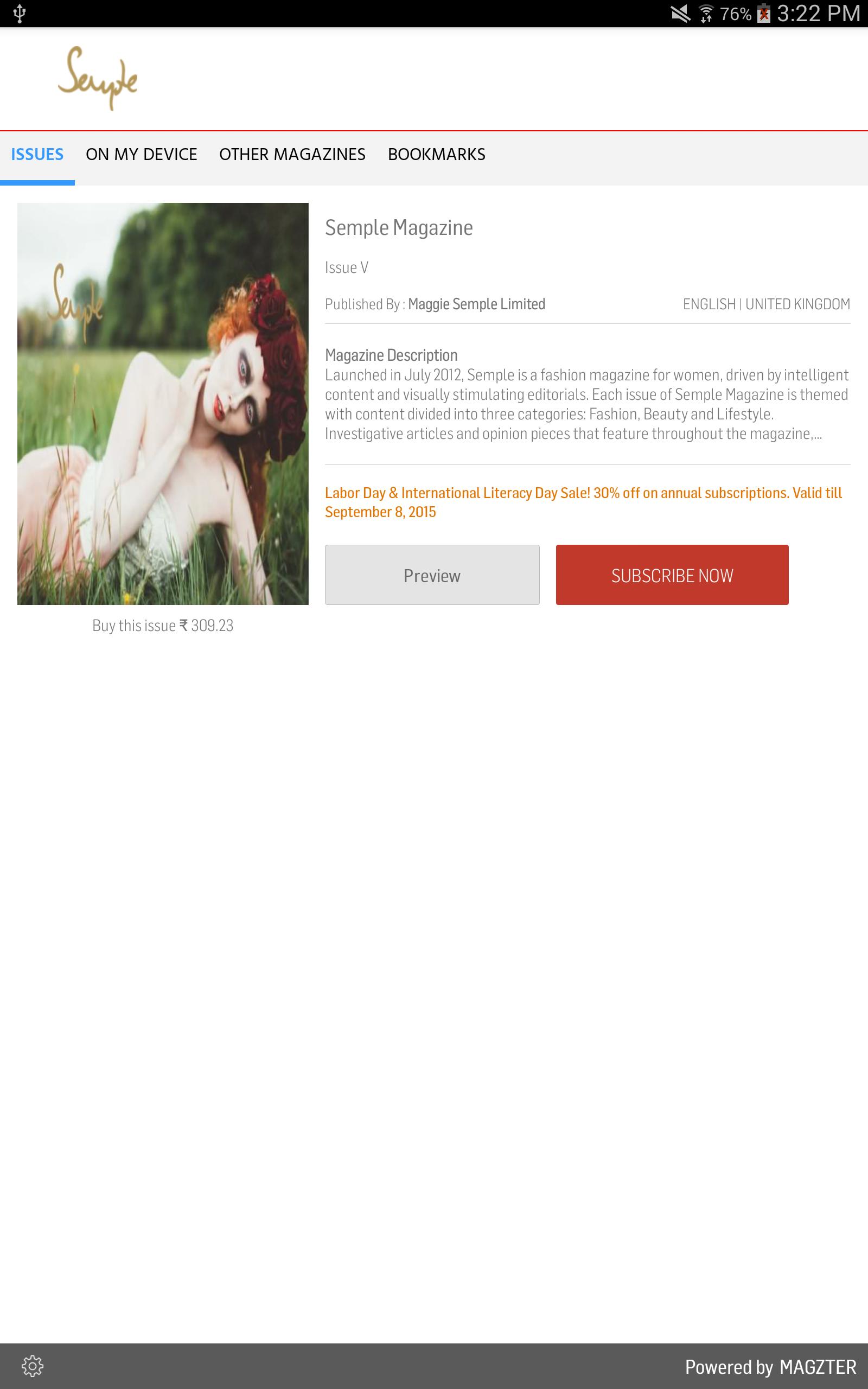 Launched in July 2012, Semple is a fashion magazine for women, driven by intelligent content and visually stimulating editorials. Each issue of Semple Magazine is themed with content divided into three categories: Fashion, Beauty and Lifestyle. Investigative articles and opinion pieces that feature throughout the magazine, provide the reader with everything they crave; a fashion magazine that appeals to their love of all things luxury, innovative and thought provoking.
