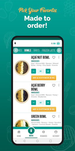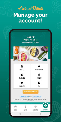 With the Main Squeeze Mobile App, not only can you easily place an order for in-store pick up, curbside delivery, or traditional delivery, but you can also learn more about each of our products’ ingredients and nutrition facts, view our menu, sign up for our rewards program, check on your rewards account balance, check your gift card balances, view your previous orders and create a favorites list to make future ordering easier.