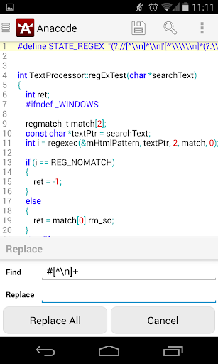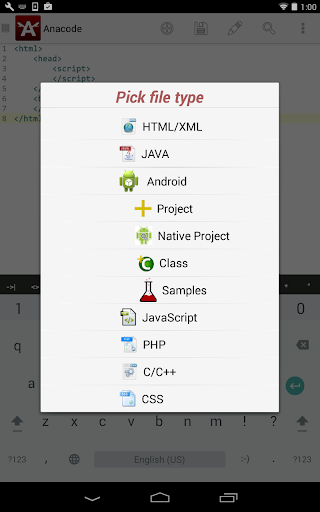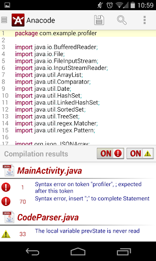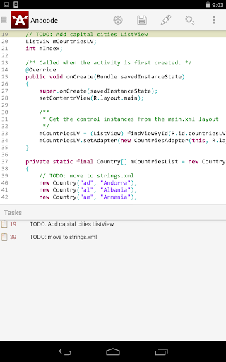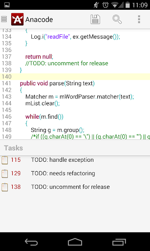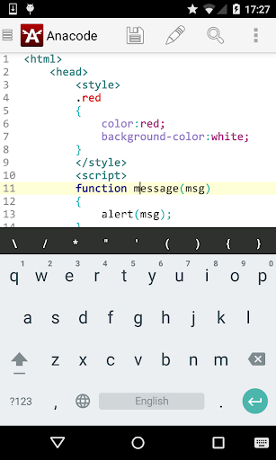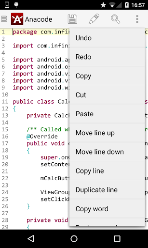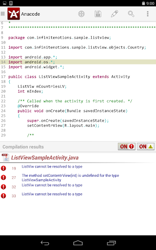Anacode is an integrated development environment and source code editor for JAVA, HTML, CSS, PHP, JavaScript and C/C files that allows you to build and run Android applications directly on the device. Anacode can directly build an APK from your android project source code by single click on the "Run" item in the menu. Just open any JAVA or XML file that's is part of your project.