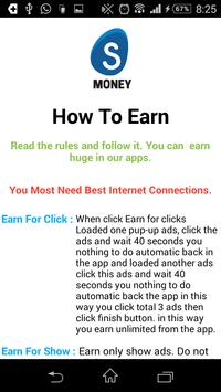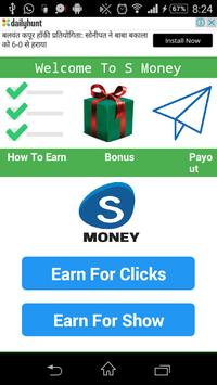 Get paid to click and by watching ads . Simple and Fast way to earn paytm cash. Instant Payment Process . S Money will provide you the great oppurtunity to earn some pocket spends.