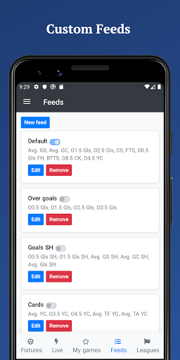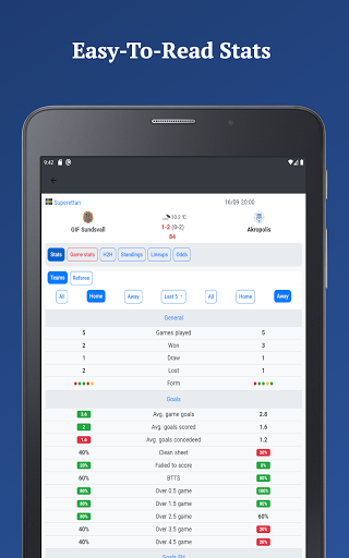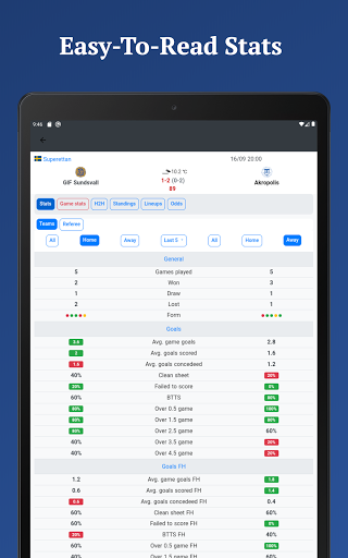 Get easy to read football stats and live scores in same app. Goals, corners, cards, HT, FT, referee stats, you can find all this in the app.