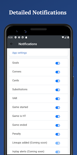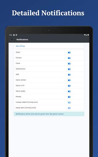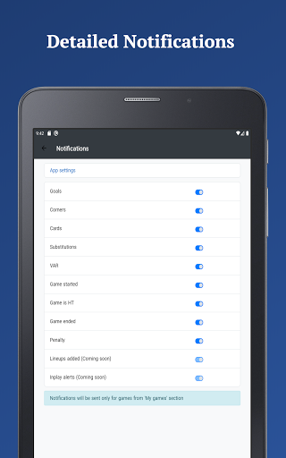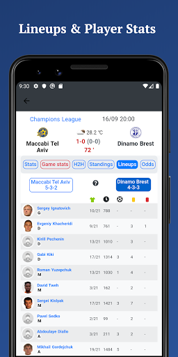 Lineups - Detailed statistics about players (games played, cards, goals, etc.). Get notifications when lineups are available for a game.