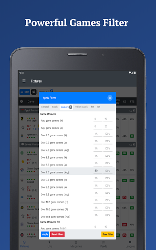 Games Filter - Search games that meets your criteria. E.g.: see only games with more than 70% over 2.5 game goals in last 5 games at home. You can search by any stat you want.