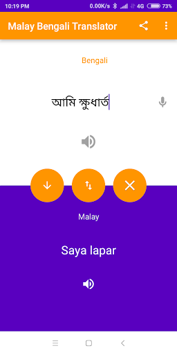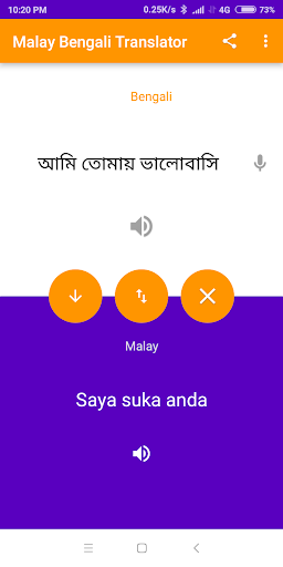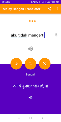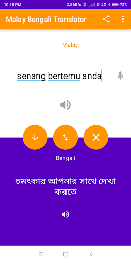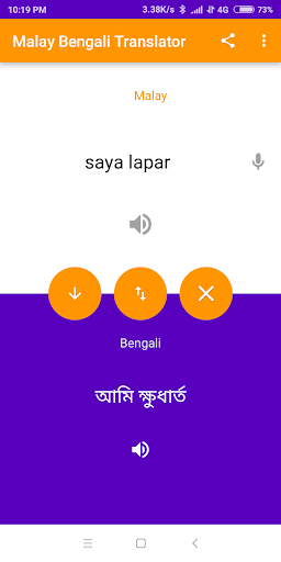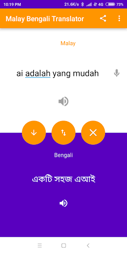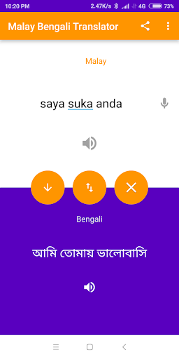 This Malay-Bengali translator is your close friend when you need to use translation service. This free Malay-Bengali translator will help you to translate very easily from Malay to Bengali and from Bengali to Malay. With its easy function, you can translate words, phrases and even sentences just in a second. Free Malay-Bengali translator is very useful in terms of daily life, traveling and other many purposes of daily life. If you go to travel, don’t forget to take this free translator app with you. This free Malay-Bengali translator is also very helpful for students and easy to use with simple interface.