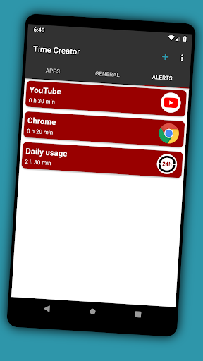 You can set limits for each app and for the daily usage. Time Creator will notify you when the time is exceeded.