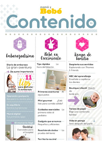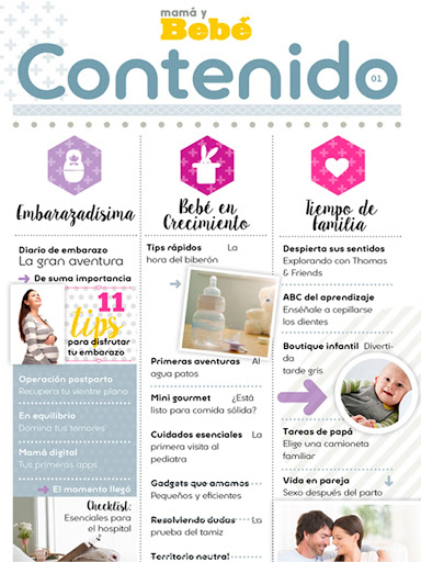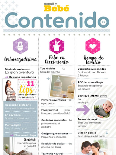 Mamá y Bebé, es una guía que las madres necesitan para saber todo sobre su embarazo y el desarrollo del bebé. Ofrece secciones como: Embarazadísima, Bebé en crecimiento y tiempo de familia con recomendaciones para integrar a la pareja y vigilar el desarrollo de los niños hasta los 5 años de edad.