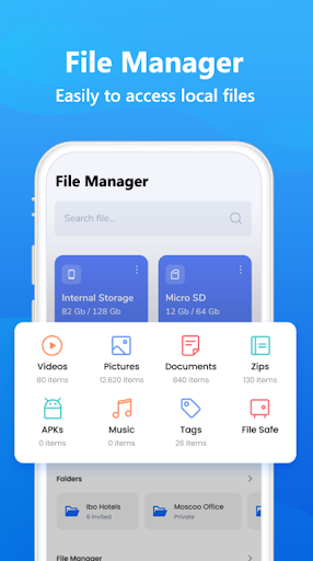 • Transfer apps, images, music, movies, documents, without using mobile data and cables. Support same Wi-Fi mode & auto-created hotspot.