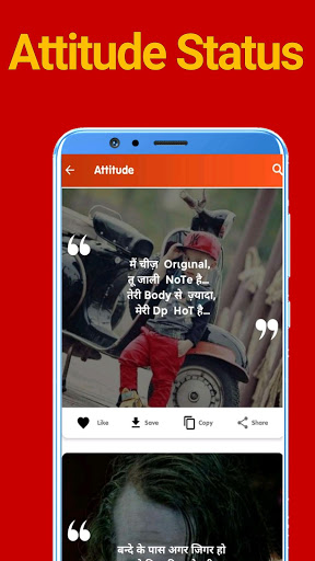 One Tap Copy, One Tap Save And One Tap Share Live Hindi Attitude Status As Text Or Image And easily set that as your WhatsApp status or FB status.