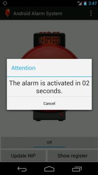 Once created, the user PIN code may activate the alarm from the terminal, the system posts a time frame during which the terminal warn the user that the alarm is activated (to let him on the stand you want). After this interval of time the alarm was activated at the time that there is a change in position, will activate a sound that could not stop unless the user tries to turn the alarm off. To turn off the alarm the user will have to enter the PIN code of the application.