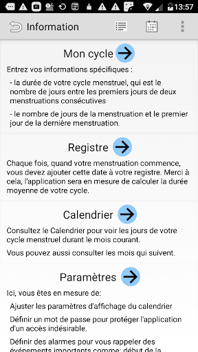 This application will let you track your menstrual cycle. You will be able to check the current phane of your cycle. It will find out your fertile and infertile days, as well as your ovulation day. You will know when it is most and least probable for you to get pregnant. The app is very precise and exreamely easy to use.