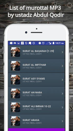 Murottal or offline Al-quran reading ustadz Abdul Qodir is a collection of MP3s that you can enjoy without the need for internet connection, with a very beautiful voice and touching the soul. Sometimes she also snobs and pauses before finally resuming her reading.