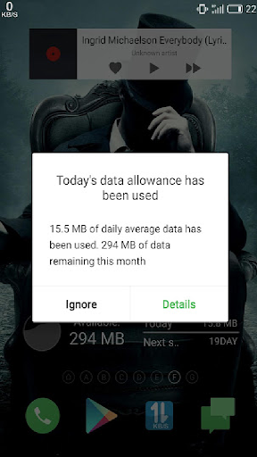 User can set monthly internet data plan and application will warn when user exceeds average daily usage of mobile internet data. In notifications application displays current internet speed, available mobile data (by default monthly data plan is 1024MB), today's mobile data usage and today's wifi data usage. In application there are displayed available mobile data and daily recommended data usage.