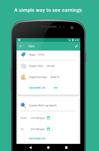 The third screen displays the details of an employee. You can open it from first or second screen by taping on a particular employee. On this screen you can see relevant information such as wage, unpaid worked hours, unpaid work logs, and an option to search past work logs. The pay button (when visible) will mark the unpaid section as paid and reset its info.