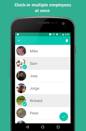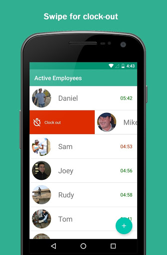 The first screen will display active employees (employees who are currently working). The time starts to run for employees on this list. To remove an employee from this list (clock out), simply swipe right or left, then the time will stop running for that employee. For breaks, tap on the timer of a particular employee, and it will pause/resume the time.