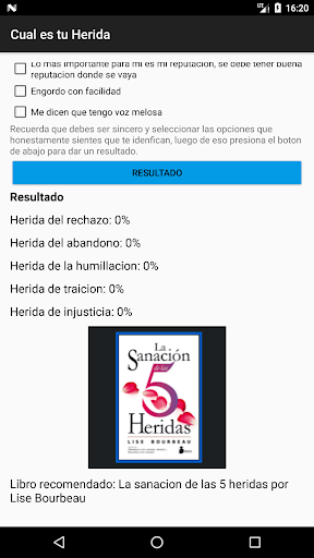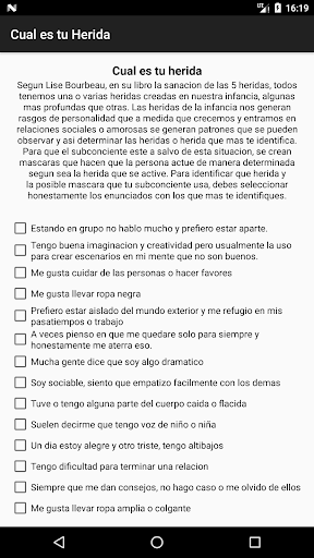 Ayon kay Lise Bourbeau, sa kanyang aklat na The Healing of the 5 Wounds, lahat tayo ay may isa o higit pang mga sugat na nilikha sa ating pagkabata, ang ilan ay mas malalim kaysa sa iba.Ang mga sugat sa pagkabata ay bumubuo ng mga katangian ng pagkatao na, habang tayo ay lumalaki at pumapasok sa mga relasyon sa lipunan o mapagmahal, ang mga pattern ay maaaring sundin at sa gayon ay matukoy ang mga sugat o sugat na karamihan ay nakikilala sa iyo.Para sa hindi malay na maging ligtas mula sa sitwasyong ito, ang mga maskara ay nilikha na gumawa ng tao na kumilos sa isang tiyak na paraan ayon sa sugat na isinaaktibo.Upang matukoy ang sugat na iyon at ang posibleng maskara na ginagamit ng iyong hindi malay, dapat mong gamitin ang app na ito.