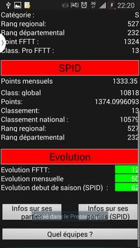 - Une recherche avancée de joueurs ( licence,nom,club) avec statistiques du joueur son évolutions FFTT , SPID sont classement département,régional, national, la liste des joueurs qu'il a battuts du SPID et FFTT et surtout une recherche de brûlage et des équipes où il a joué avec feuilles de matchs détaillées de toutes les journées. Affichage de la liste des joueurs des clubs avec évolutions de chaques membre, affichage des équipes etc.