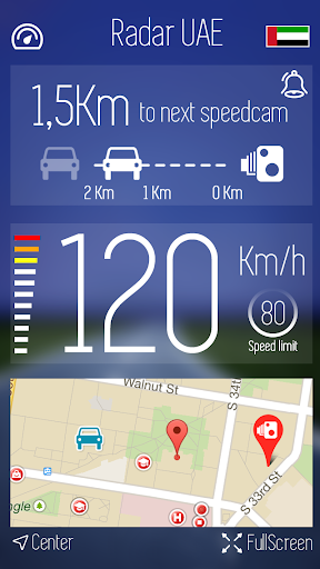 Radar UAE displays the positioning of speed cameras in United Arab Emirates, as well as your position on the map and the speed you are driving at.
