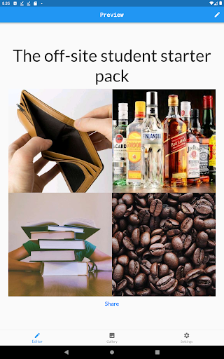 Gallery contains all the memes created by other users, and you will be able to browse them by tags (for example “school, university”) and to share them with your friends.