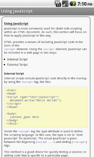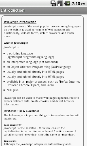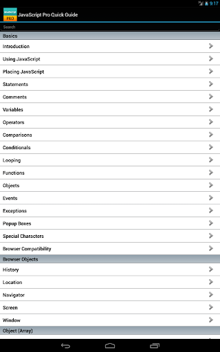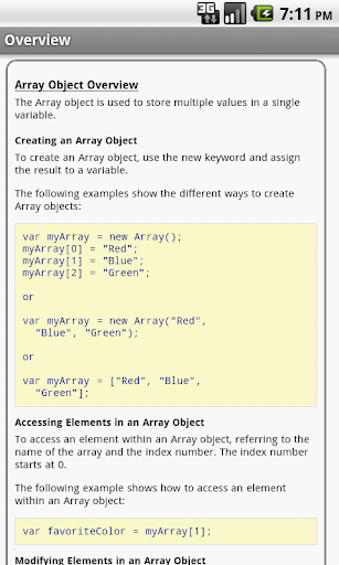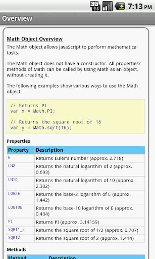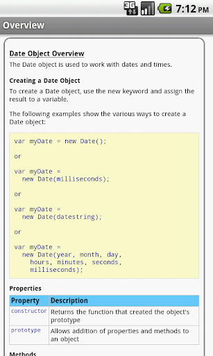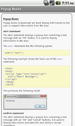 The JavaScript properties/functions/methods are categorized and searchable. Each detailed information screen contains a description, parameters, examples, browser compatibility, and more. In addition, most of the examples include the actual output.
