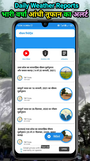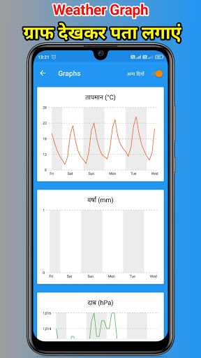 Is App me aap ko dekhne ko milega aaj ke mausam ki jankari saath me aap dekh sakte hain ki Aaj barish hogi ya nahi, hava ki gati, aandhi toofan, tapman, thand aur 15 din baad tak ke mosam ka hal. Bahut se log Janna chahte Hain ki Aaj ka mausam kaisa rahega jisse ve apne daily ke karyon ka prabandhan Kar saken aur mausam vibhag ki chetawani se update rahen.